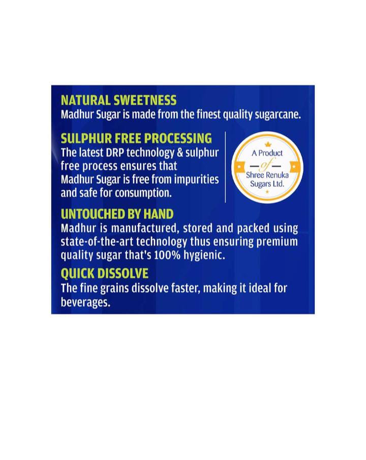 Madhur Pure & Hygienic White Sugar (1 kg) Madhur Sugar is a premium, refined white granulated sugar produced by Shree Renuka Sugars. It is marketed as a high-quality, pure, and hygienically processed product suitable for all culinary needs. Key Features and The '5S Guarantee' Madhur Sugar is often promoted with a "5S Guarantee" for quality and safety: Safed (White): Sparkling, bright white, and consistently sized crystals that are a visual delight. Sulphur-Free Process: It is refined using an advanced sulphur-free process, ensuring the sugar is free from harmful sulphur compounds and retains its natural purity. This prevents sugar syrup from turning yellow. Shuddh (Pure): Made from superior quality sugarcane and refined using cutting-edge technology and stringent testing standards to ensure high purity. Samaan (Consistent): Ensures uniform grain size and sweetness in every spoonful. Surakshit (Safe/Hygienic): The entire process, from plant to packaging, is fully automated and untouched by hand (zero human contact) in FSSC 22000 certified plants to guarantee the highest level of hygiene and safety. Product Specifications Type: Refined White Granulated Sugar (Sucrose). Purity: Typically over 99% pure sucrose. Form: Free-flowing, sparkling white crystals (usually small to medium grain size for quick dissolving). Source: Derived from premium quality sugarcane. Packaging: Sealed in a 1 kg hygienic plastic pouch/bag designed to retain freshness. Ideal For: Everyday sweetening of beverages (tea, coffee), baking (cakes, cookies), preparing desserts, and all forms of cooking.